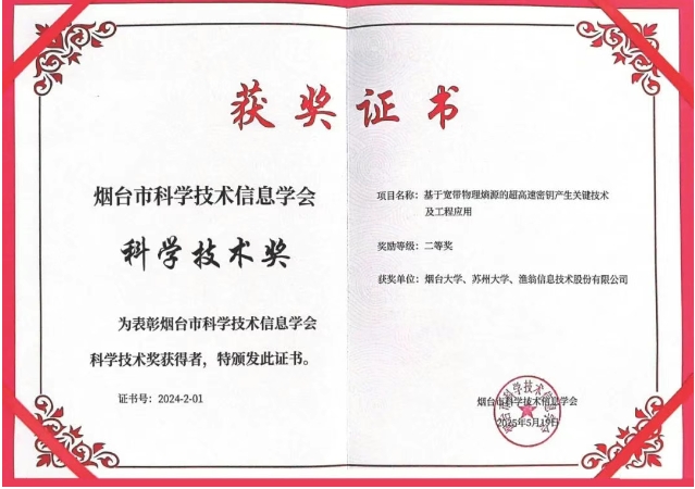 近期,2024年度烟台市科学技术信息学会科学技术奖颁奖典礼在中国科研实验室烟台海岸带研究所隆重举行。BG大游集团BG信息与烟台大学、苏州大学联合完成的 "基于宽带物理熵源的超高速密钥产生关键技术及工程应用" 项目荣获科学技术奖二等奖。